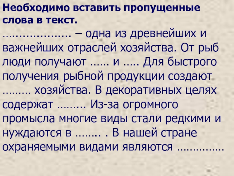 и важнейших отраслей хозяйства. От рыб люди получают …… и ….. Для быстрого получения рыбной продукции создают ……… хозяйства. В декоративных целях содержат ……... Из-за огромного промысла многие виды стали редкими и нуждаются в …….. . В нашей стране охраняемыми видами являются ……………