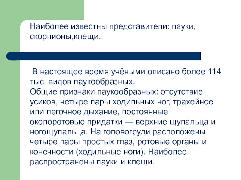 Наиболее известны представители: пауки,скорпионы,клещи. В настоящее время учёными описано более 114 тыс. видов паукообразных. Общие признаки паукообразных: отсутствие