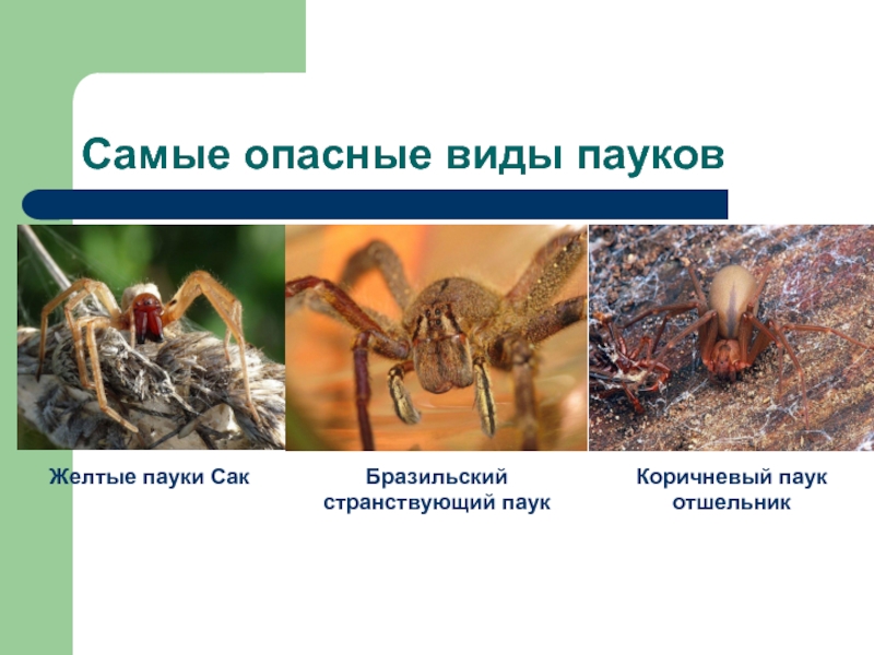 Самые опасные виды пауковЖелтые пауки Сак Бразильский странствующий паук Коричневый паук отшельник