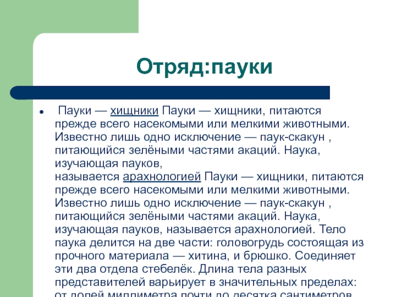 Отряд:пауки Пауки — хищники Пауки — хищники, питаются прежде всего насекомыми или мелкими животными. Известно лишь одно исключение — паук-скакун , питающийся зелёными частями акаций.