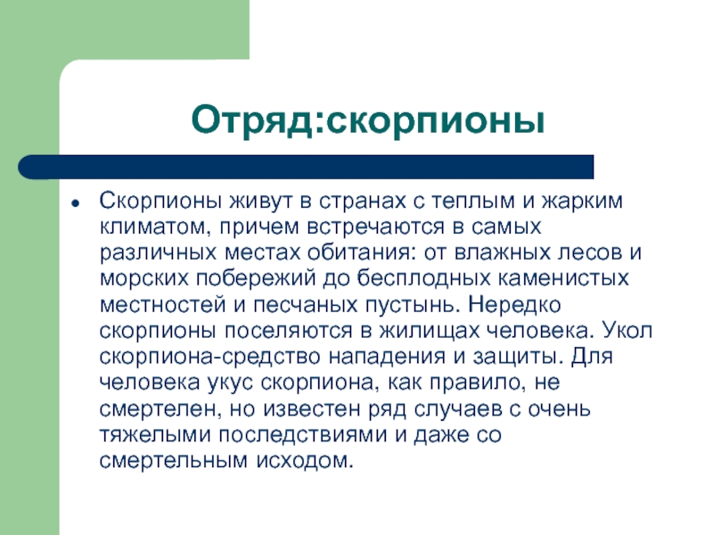 в самых различных местах обитания: от влажных лесов и морских побережий до бесплодных каменистых местностей и песчаных пустынь. Нередко скорпионы поселяются в жилищах человека. Укол скорпиона-средство нападения и защиты. Для человека укус скорпиона, как правило, не смертелен, но известен ряд случаев с очень тяжелыми последствиями и даже со смертельным исходом.