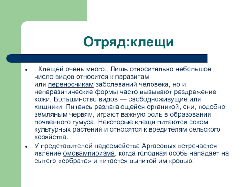 паразитам или переносчикам заболеваний человека, но и непаразитические формы часто вызывают раздражение кожи. Большинство видов — свободноживущие или хищники. Питаясь разлагающейся органикой, они, подобно земляным червям, играют важную роль в образовании почвенного гумуса. Некоторые клещи питаются соком культурных растений и относятся к вредителям сельского хозяйства.