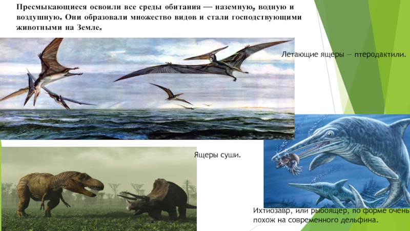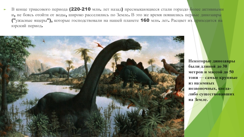 В конце триасового периода (220-210 млн. лет назад) пресмыкающиеся стали гораздо более активными и, не боясь отойти от воды, широко расселились по Земле. В это же время появились первые динозавры ("ужасные ящеры"), которые господствовали на нашей планете 160 млн. лет. Расцвет их приходится на юрский период.