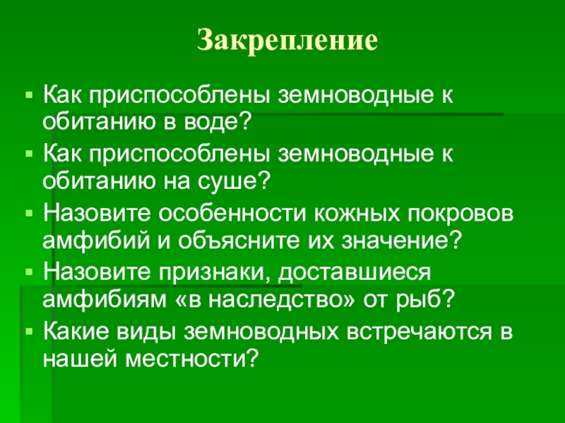 1. Раскрыть особенности внешнего строения земноводных, связанных с жизнью на суше и размножением в воде.