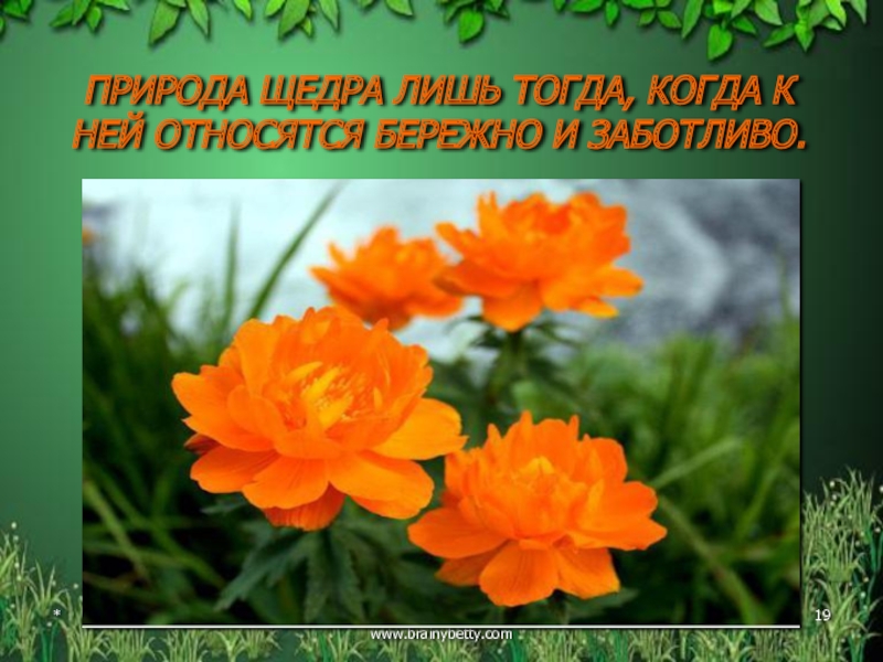 Слайд 19ПРИРОДА ЩЕДРА ЛИШЬ ТОГДА, КОГДА К НЕЙ ОТНОСЯТСЯ БЕРЕЖНО И ЗАБОТЛИВО.