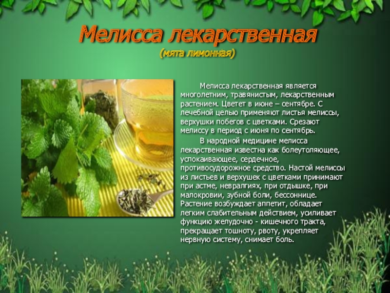 В народной медицине мелисса лекарственная известна как болеутоляющее, успокаивающее, сердечное, противосудорожное средство. Настой мелиссы из листьев и верхушек с цветками принимают при астме, невралгиях, при отдышке, при малокровии, зубной боли, бессоннице. Растение возбуждает аппетит, обладает легким слабительным действием, усиливает функцию желудочно - кишечного тракта, прекращает тошноту, рвоту, укрепляет нервную систему, снимает боль.