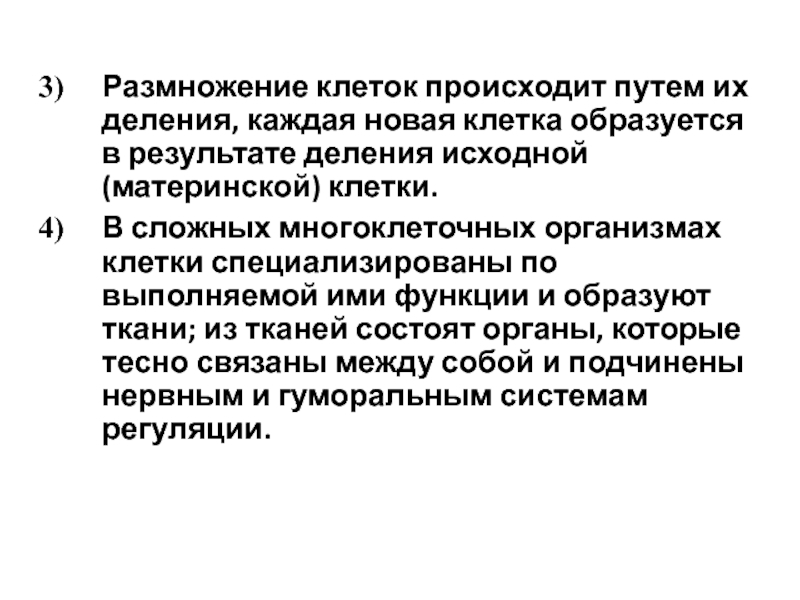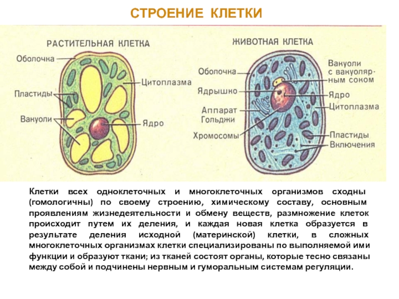 по своему строению, химическому составу, основным проявлениям жизнедеятельности и обмену веществ, размножение клеток происходит путем их деления, и каждая новая клетка образуется в результате деления исходной (материнской) клетки, в сложных многоклеточных организмах клетки специализированы по выполняемой ими функции и образуют ткани; из тканей состоят органы, которые тесно связаны между собой и подчинены нервным и гуморальным системам регуляции.