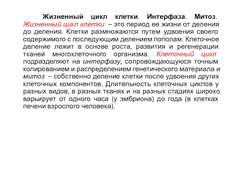 ее жизни от деления до деления. Клетки размножаются путем удвоения своего содержимого с последующим делением пополам. Клеточное деление лежит в основе роста, развития и регенерации тканей многоклеточного организма. Клеточный цикл подразделяют на интерфазу, сопровождающуюся точным копированием и распределением генетического материала и митоз – собственно деление клетки после удвоения других клеточных компонентов. Длительность клеточных циклов у разных видов, в разных тканях и на разных стадиях широко варьирует от одного часа (у эмбриона) до года (в клетках печени взрослого человека).