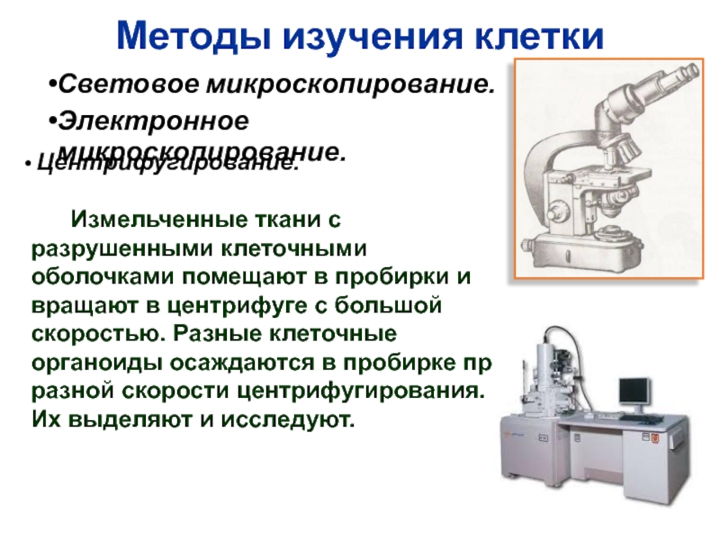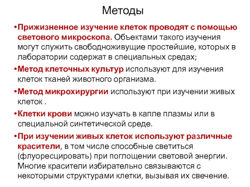 Прижизненное изучение клеток проводят с помощью светового микроскопа. Объектами такого изучения