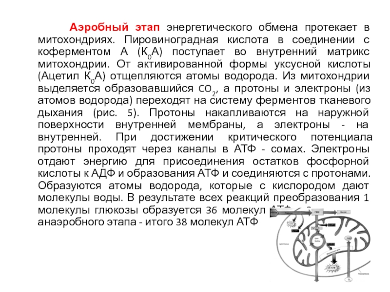 с коферментом А (К0А) поступает во внутренний матрикс митохондрии. От активированной формы уксусной кислоты (Ацетил К0А) отщепляются атомы водорода. Из митохондрии выделяется образовавшийся CO2, а протоны и электроны (из атомов водорода) переходят на систему ферментов тканевого дыхания (рис. 5). Протоны накапливаются на наружной поверхности внутренней мембраны, а электроны - на внутренней. При достижении критического потенциала протоны проходят через каналы в АТФ - сомах. Электроны отдают энергию для присоединения остатков фосфорной кислоты к АДФ и образования АТФ и соединяются с протонами. Образуются атомы водорода, которые с кислородом дают молекулы воды. В результате всех реакций преобразования 1 молекулы глюкозы образуется 36 молекул АТФ + 2 молекулы анаэробного этапа - итого 38 молекул АТФ