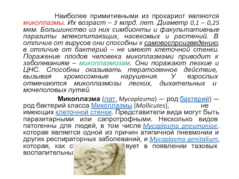 лет. Диаметр 0,1 – 0,25 мкм. Большинство из них симбионты и факультативные паразиты млекопитающих, насекомых и растений. В отличие от вирусов они способны к самовоспроизведению, в отличие от бактерий – не имеют клеточной стенки. Поражение плодов человека микоплазмами приводит к заболеваниям – микоплазмозам. Они поражают легкие и ЦНС. Способны оказывать тератогенное действие, вызывая хромосомные нарушения. У взрослых отмечаются микоплазмозы легких, дыхательных и мочеполовых путей.