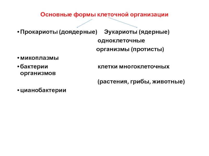 имеют клеточного строения. Все остальные организмы представлены различными клеточными формами жизни. Все это разнообразие можно разделить на две группы живых организмов, различающихся клеточной организацией: прокариоты и эукариоты.