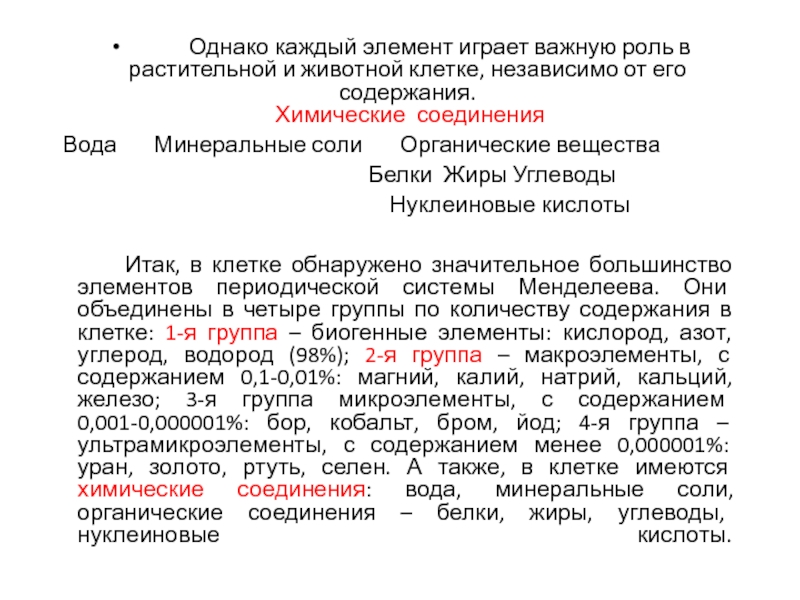 Слайд 12 Однако каждый элемент играет важную роль в растительной и животной клетке,