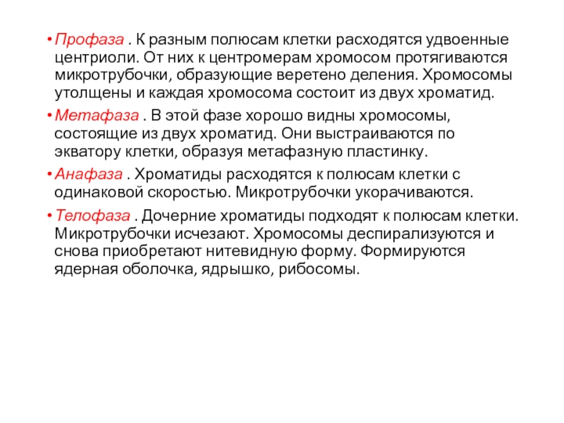 Телофаза . Дочерние хроматиды подходят к полюсам клетки. Микротрубочки исчезают. Хромосомы деспирализуются и снова приобретают нитевидную форму. Формируются ядерная оболочка, ядрышко, рибосомы.