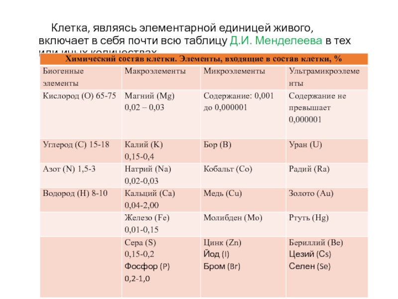 Слайд 11 Клетка, являясь элементарной единицей живого, включает в себя почти всю таблицу