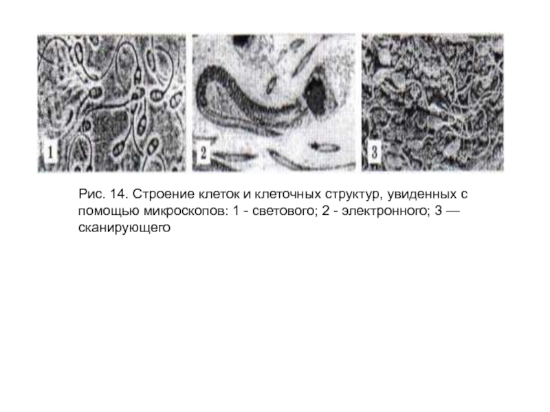 Слайд 8Рис. 14. Строение клеток и клеточных структур, увиденных с помощью микроскопов: