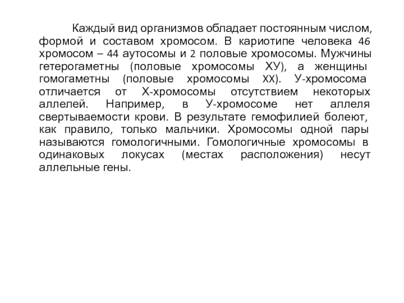 кариотипе человека 46 хромосом – 44 аутосомы и 2 половые хромосомы. Мужчины гетерогаметны (половые хромосомы ХУ), а женщины гомогаметны (половые хромосомы XX). У-хромосома отличается от Х-хромосомы отсутствием некоторых аллелей. Например, в У-хромосоме нет аллеля свертываемости крови. В результате гемофилией болеют, как правило, только мальчики. Хромосомы одной пары называются гомологичными. Гомологичные хромосомы в одинаковых локусах (местах расположения) несут аллельные гены.