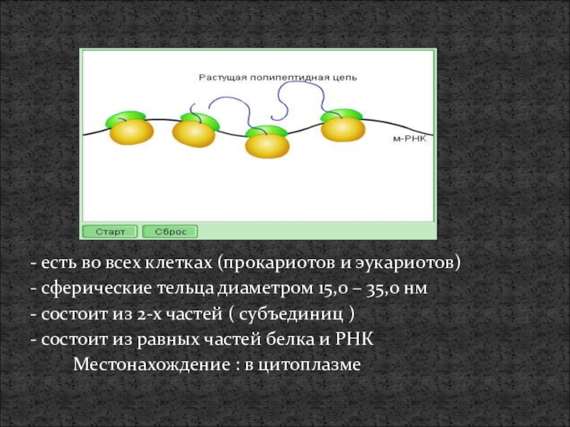 - есть во всех клетках (прокариотов и эукариотов)- сферические тельца диаметром 15,0 – 35,0 нм- состоит из