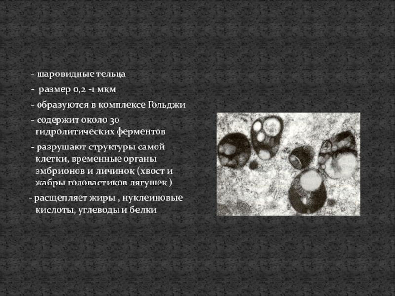 - шаровидные тельца  - размер 0,2 -1 мкм  - образуются в комплексе Гольджи