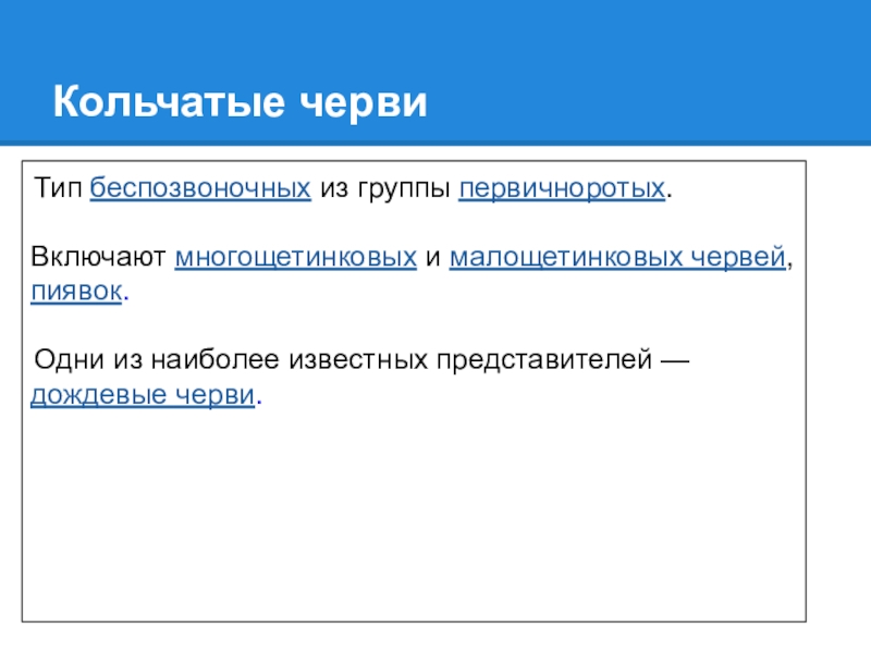 Кольчатые черви Тип беспозвоночных из группы первичноротых.Включают многощетинковых и малощетинковых червей, пиявок. Одни из наиболее известных представителей — дождевые черви.