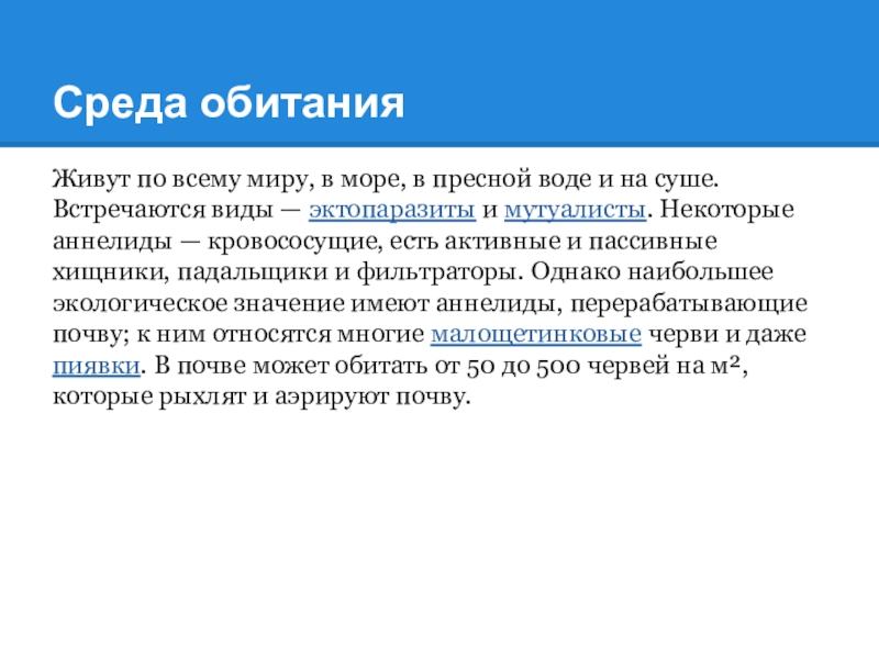 на суше. Встречаются виды — эктопаразиты и мутуалисты. Некоторые аннелиды — кровососущие, есть активные и пассивные хищники, падальщики и фильтраторы. Однако наибольшее экологическое значение имеют аннелиды, перерабатывающие почву; к ним относятся многие малощетинковые черви и даже пиявки. В почве может обитать от 50 до 500 червей на м², которые рыхлят и аэрируют почву.