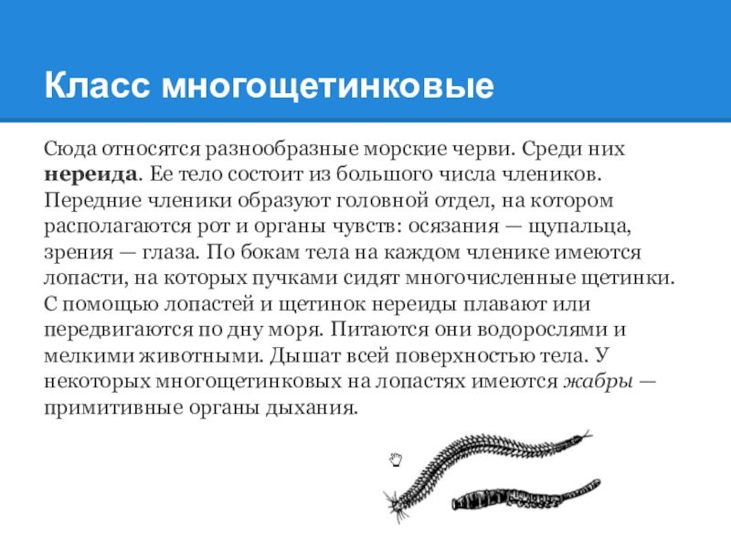 Класс многощетинковыеСюда относятся разнообразные морские черви. Среди них нереида. Ее тело состоит из большого числа члеников. Передние