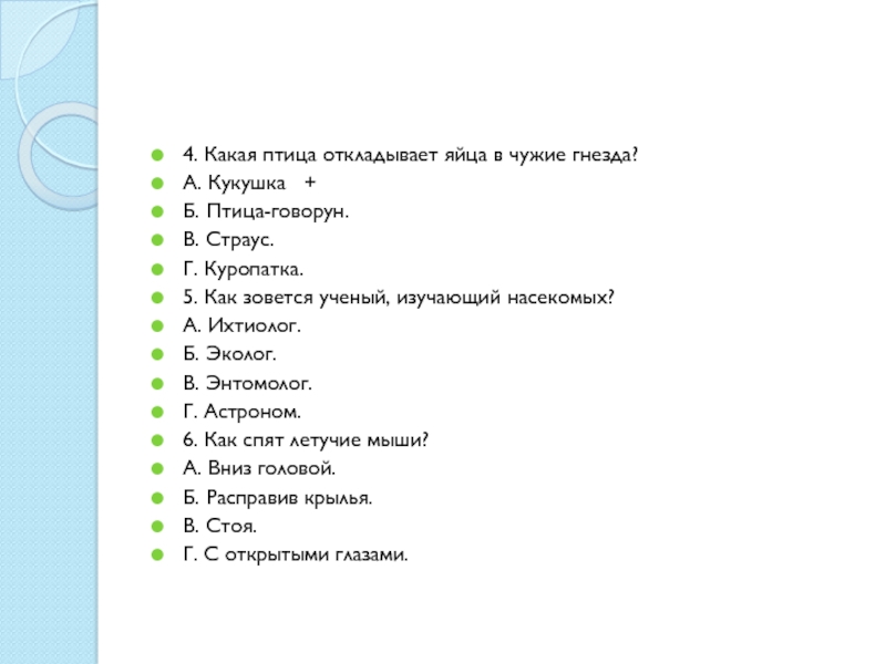 4. Какая птица откладывает яйца в чужие гнезда?А. Кукушка   +Б. Птица-говорун.В. Страус.Г. Куропатка.5. Как зовется ученый, изучающий