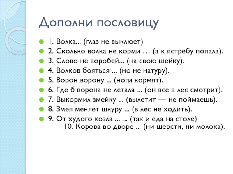 Дополни пословицу1. Волка... (глаз не выклюет)2. Сколько волка не корми … (а к ястребу попала). 3. Слово