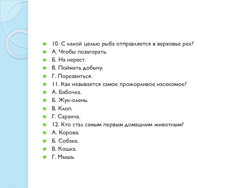 10. С какой целью рыба отправляется в верховье рек?A. Чтобы позагорать.Б. На нерест.B. Поймать добычу.Г. Порезвиться.11. Как