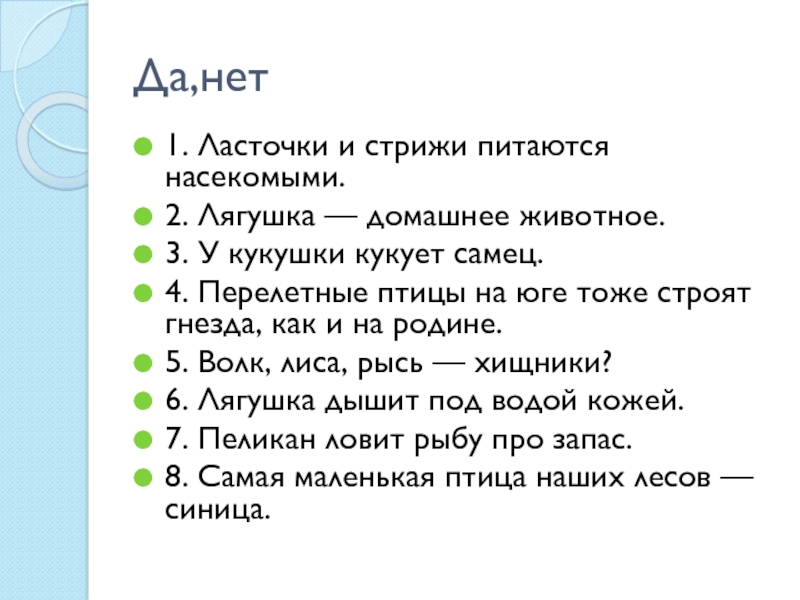 Да,нет1. Ласточки и стрижи питаются насекомыми. 2. Лягушка — домашнее животное. 3. У кукушки кукует самец. 4.