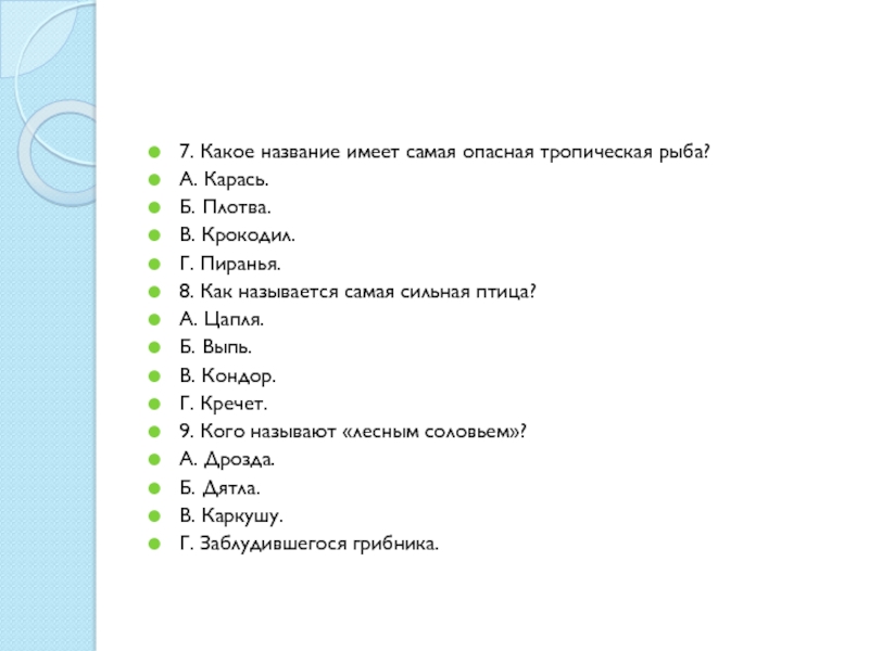 7. Какое название имеет самая опасная тропическая рыба?A. Карась.Б. Плотва.B. Крокодил.Г. Пиранья.8. Как называется самая сильная птица?A.