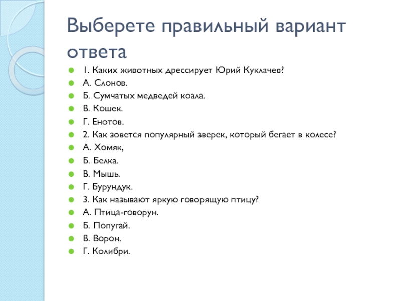 Выберете правильный вариант ответа1. Каких животных дрессирует Юрий Куклачев?А. Слонов.Б. Сумчатых медведей коала.В. Кошек.Г. Енотов.2. Как зовется