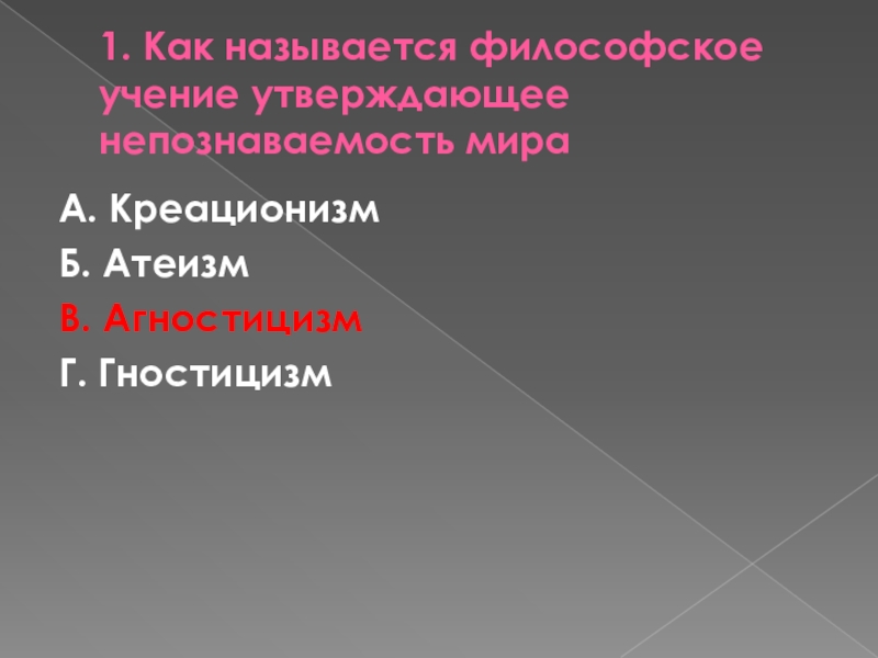 Слайд 831. Как называется философское учение утверждающее непознаваемость мира