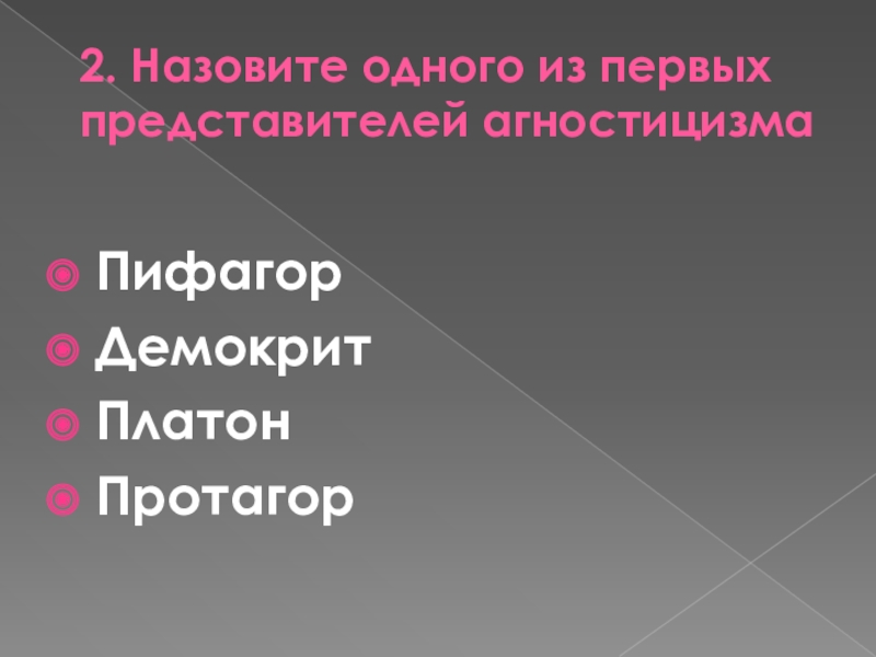 Слайд 852. Назовите одного из первых представителей агностицизма