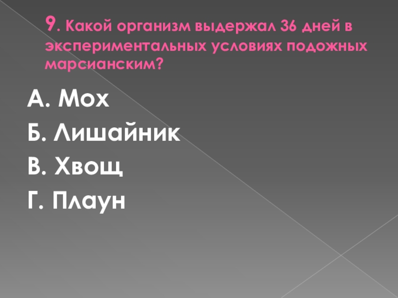 Слайд 989. Какой организм выдержал 36 дней в экспериментальных условиях подожных марсианским?