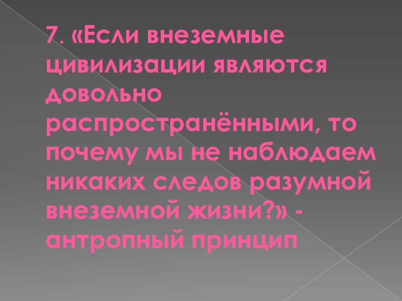 наблюдаем никаких следов разумной внеземной жизни?» -антропный принцип (нет –парадокс Ферми)