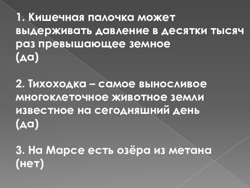 Слайд 1031. Кишечная палочка может выдерживать давление в десятки тысяч раз превышающее