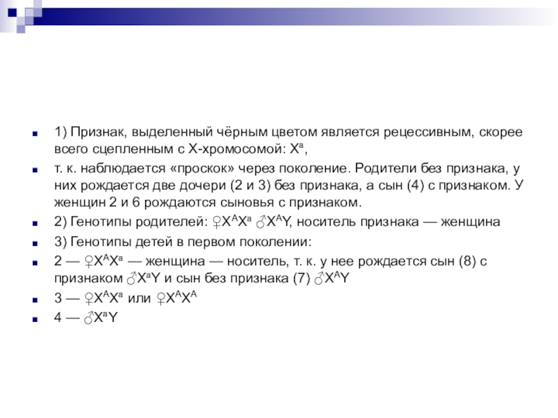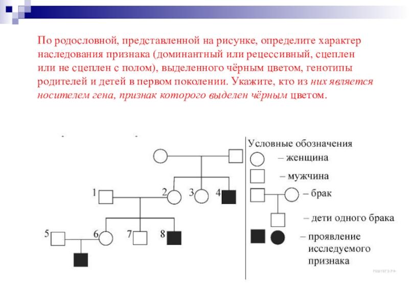 рецессивный, сцеплен или не сцеплен с полом), выделенного чёрным цветом, генотипы родителей и детей в первом поколении. Укажите, кто из них является носителем гена, признак которого выделен чёрным цветом.