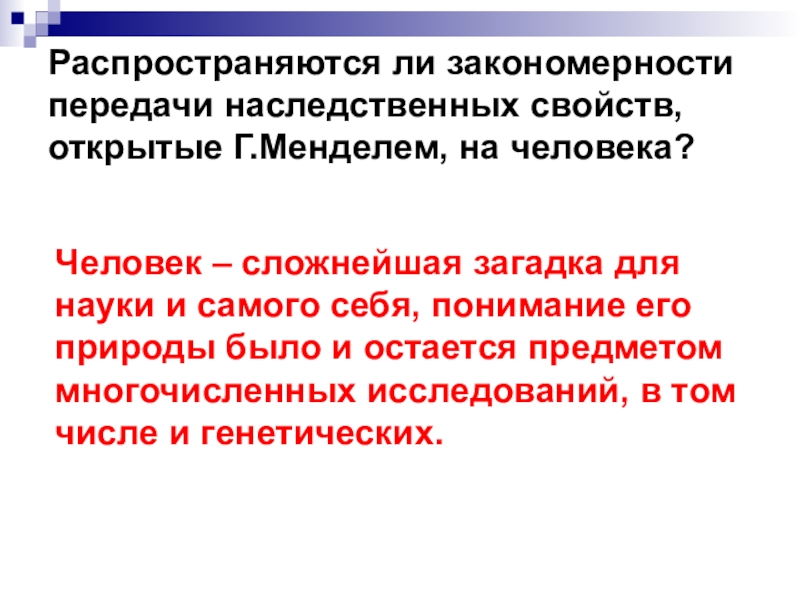 Слайд 14Распространяются ли закономерности передачи наследственных свойств, открытые Г.Менделем, на человека?