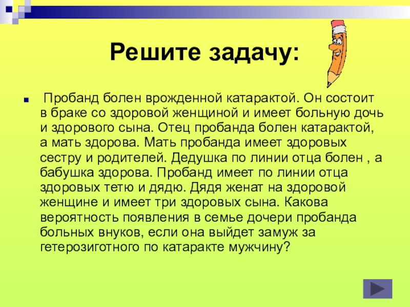 здоровой женщиной и имеет больную дочь и здорового сына. Отец пробанда болен катарактой, а мать здорова. Мать пробанда имеет здоровых сестру и родителей. Дедушка по линии отца болен , а бабушка здорова. Пробанд имеет по линии отца здоровых тетю и дядю. Дядя женат на здоровой женщине и имеет три здоровых сына. Какова вероятность появления в семье дочери пробанда больных внуков, если она выйдет замуж за гетерозиготного по катаракте мужчину?