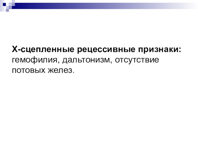 Слайд 41Х-сцепленные рецессивные признаки: гемофилия, дальтонизм, отсутствие потовых желез.