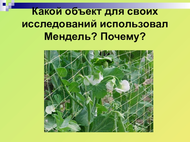 Слайд 12Какой объект для своих исследований использовал Мендель? Почему?