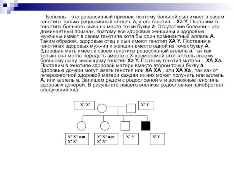 больной сын имеет в своем генотипе только рецессивный аллель а, и его генотип - Ха Y. Поставим в генотипе больного сына на месте точки букву а. Отсутствие болезни – это доминантный признак, поэтому все здоровые женщины и здоровые мужчины имеют в своем генотипе хотя бы один доминантный аллель А. Таким образом, здоровые отец и сын имеют генотип ХА Y. Поставим в генотипах здоровых мужчин и женщин вместо одной из точек букву А. Здоровая мать имеет в своем генотипе рецессивный аллель а, так как только она могла передать вместе с Х-хромосомой этот аллель своему больному сыну, имеющему генотип Ха Y. Поэтому генотип матери – ХА Ха. Поставим в генотипе здоровой матери вместо второй точки букву а. Здоровые дочери могут иметь генотип или ХА ХА , или ХА Ха , так как от гетерозиготной здоровой матери каждая из них может получить или аллель А, или аллель а. Запишем рядом с родословной эти возможные генотипы здоровых дочерей. В результате нашего анализа родословная приобретает следующий вид: