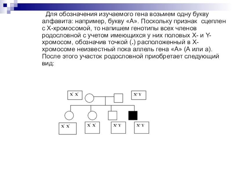 алфавита: например, букву «А». Поскольку признак сцеплен с Х-хромосомой, то напишем генотипы всех членов родословной с учетом имеющихся у них половых Х- и Y-хромосом, обозначив точкой (.) расположенный в Х-хромосоме неизвестный пока аллель гена «А» (А или а). После этого участок родословной приобретает следующий вид: