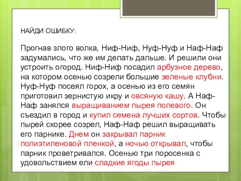 Прогнав злого волка, Ниф-Ниф, Нуф-Нуф и Наф-Наф задумались, что же им делать дальше. И решили они устроить огород. Ниф-Ниф посадил арбузное дерево, на котором осенью созрели большие зеленые клубни. Нуф-Нуф посеял горох, а осенью из его семян приготовил зернистую икру и овсяную кашу. А Наф-Наф занялся выращиванием пырея полевого. Он съездил в город и купил семена лучших сортов. Чтобы пырей скорее созрел, Наф-Наф решил выращивать его парнике. Днем он закрывал парник полиэтиленовой пленкой, а ночью открывал, чтобы парник проветривался. Осенью три поросенка с удовольствием ели сладкие ягоды пырея
