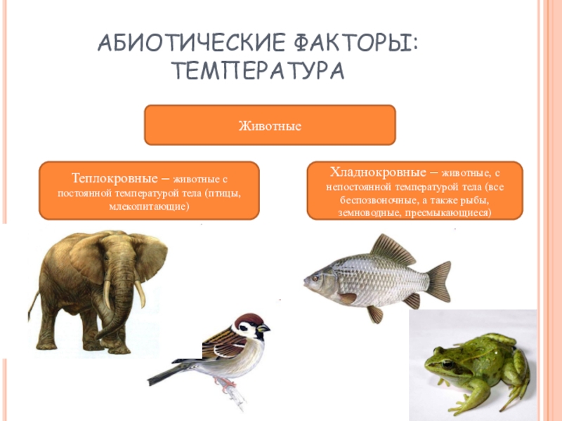 Хладнокровные – животные, с непостоянной температурой тела (все беспозвоночные, а также рыбы, земноводные, пресмыкающиеся)