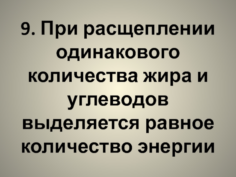 9. При расщеплении одинакового количества жира и углеводов выделяется равное количество энергии