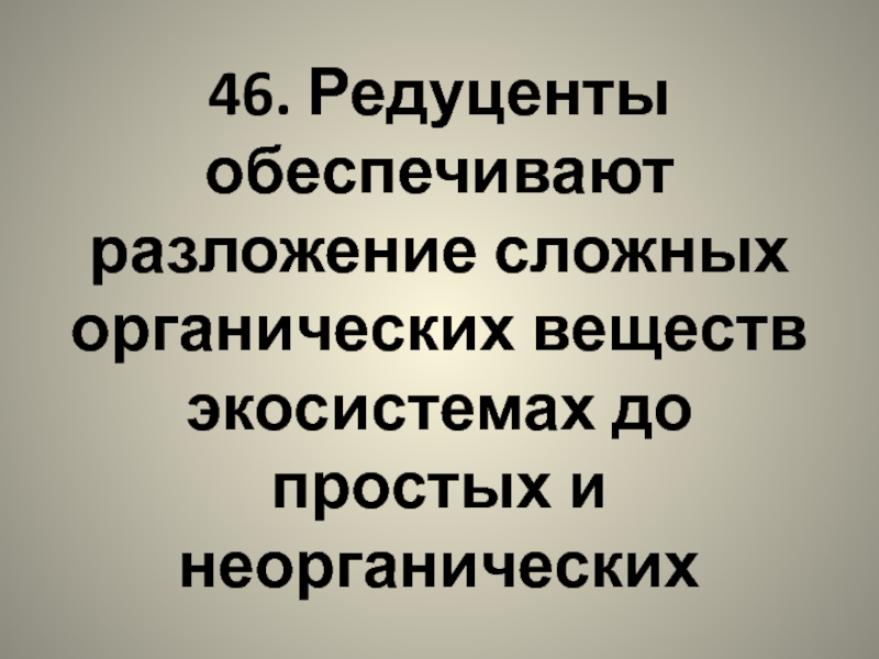 Слайд 4846. Редуценты обеспечивают разложение сложных органических веществ экосистемах до простых и