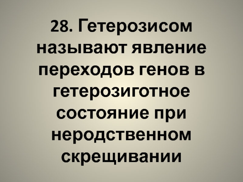 Слайд 3028. Гетерозисом называют явление переходов генов в гетерозиготное состояние при неродственном