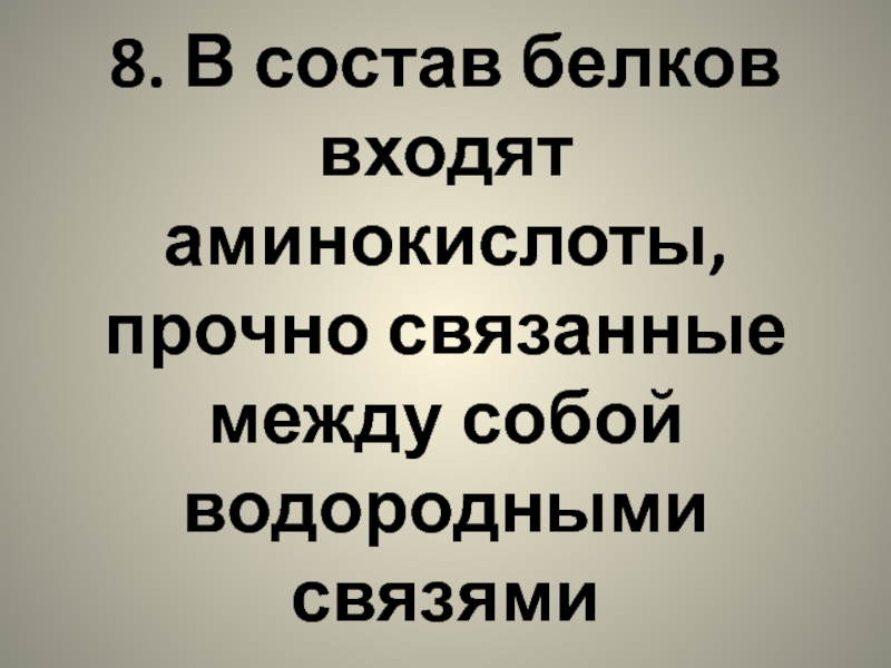 8. В состав белков входят аминокислоты, прочно связанные между собой водородными связями